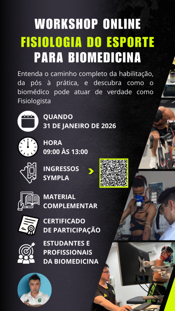 Tudo o que o biomédico precisa saber para atuar como fisiologista: habilitação, vivência prática, testes, pós-graduação e mercado de trabalho: explicado de forma objetiva e aplicada no “Workshop: Fisiologia do Esporte para Biomedicina”.